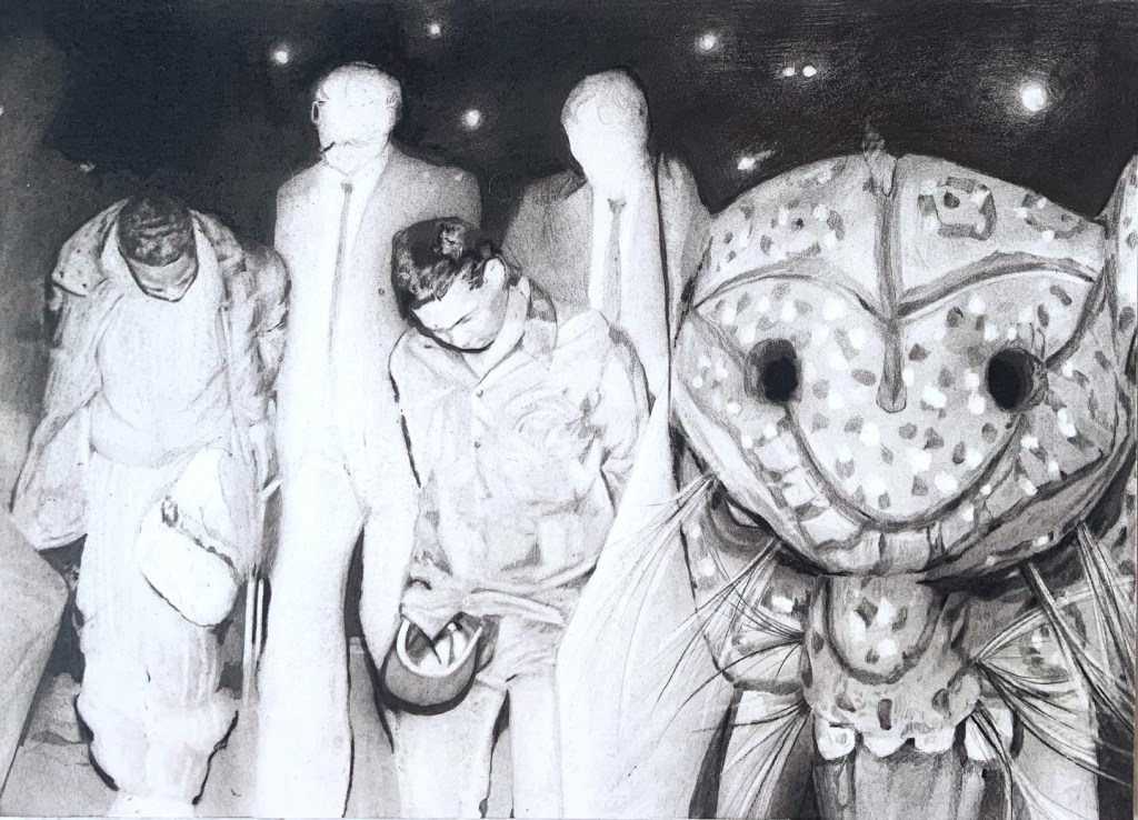 Titan (snk), masques et l’oiseau.x, 2024, crayon sur papier satiné, 760 x 560 mm