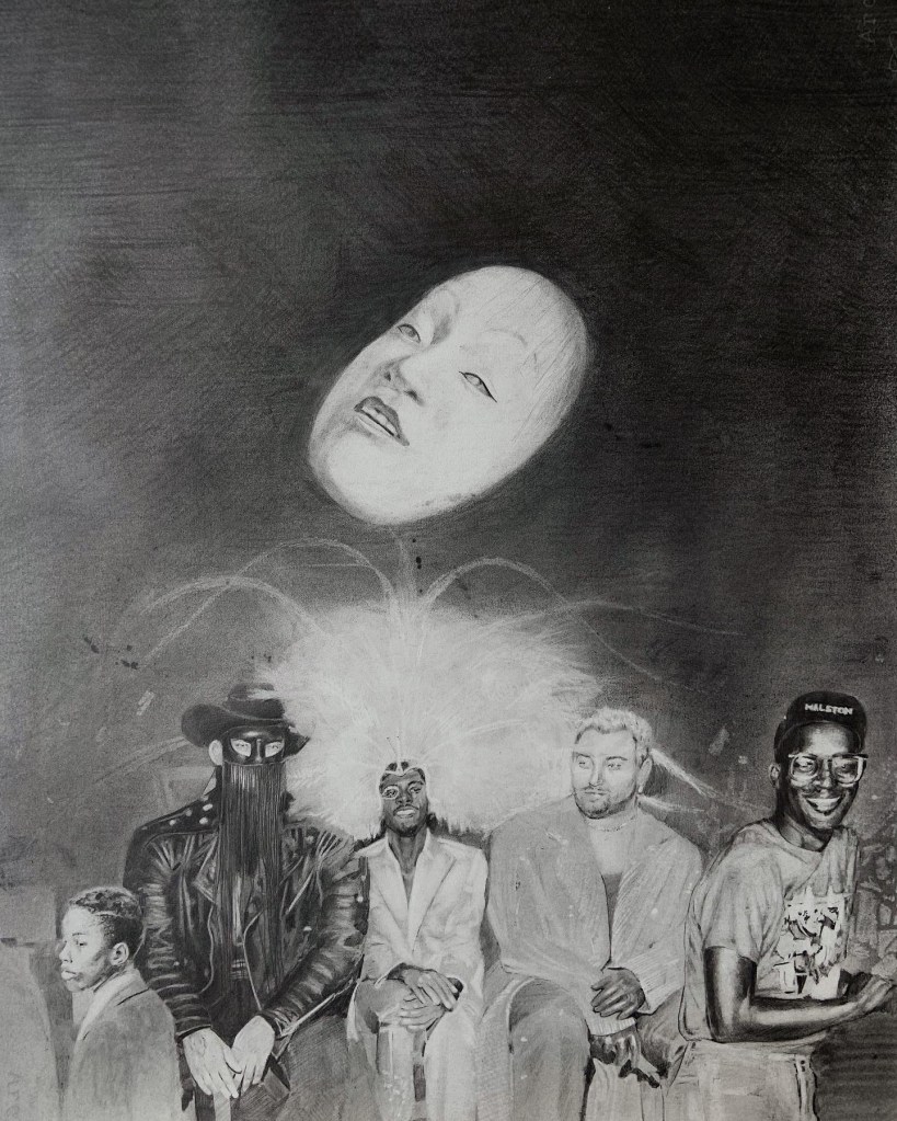 Masque.s, Korey Wise, Orville Peck, Montero, Sam Smith, Tony Hughs, 2023, crayon sur papier, 76 x 56 cm